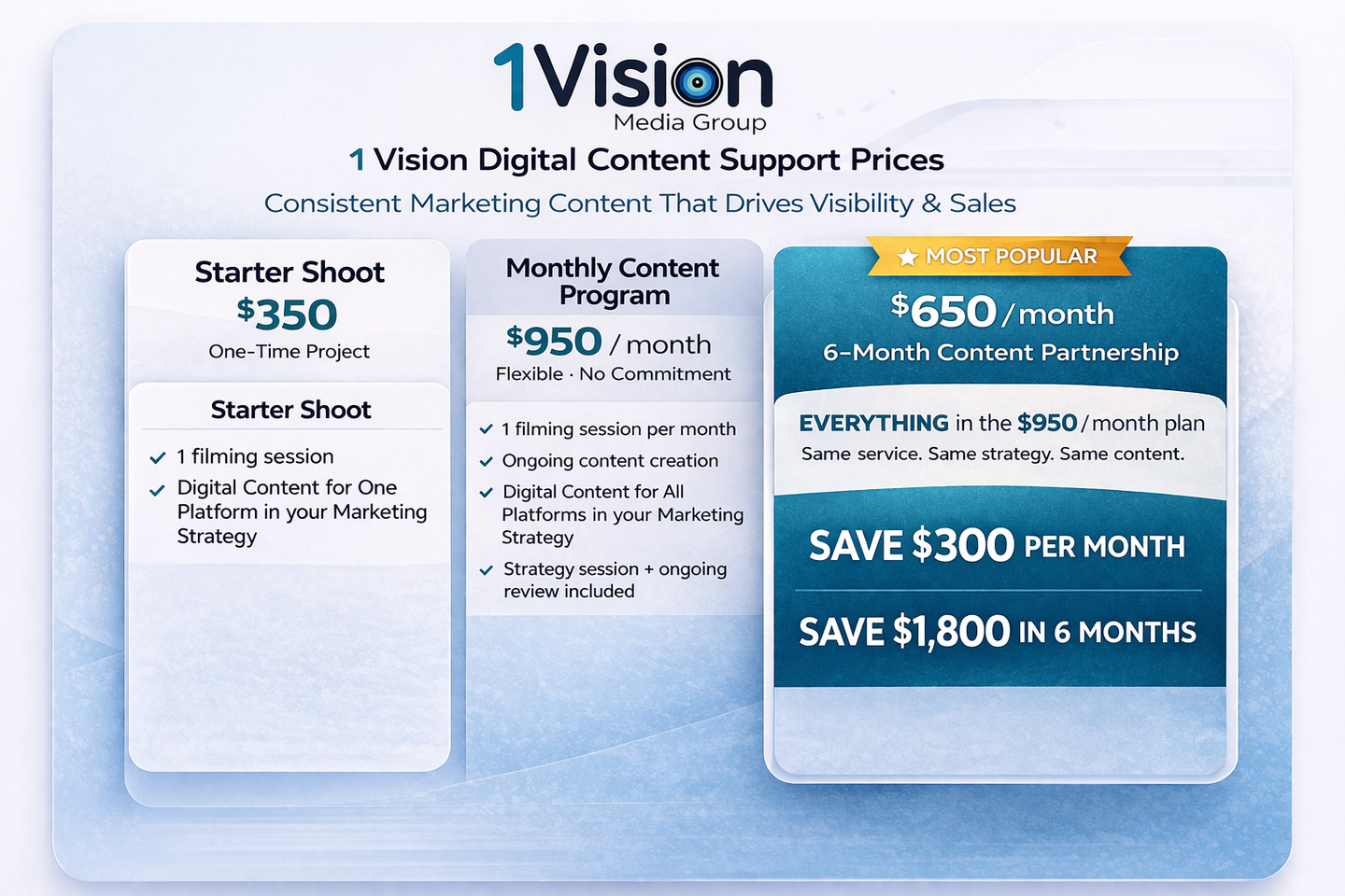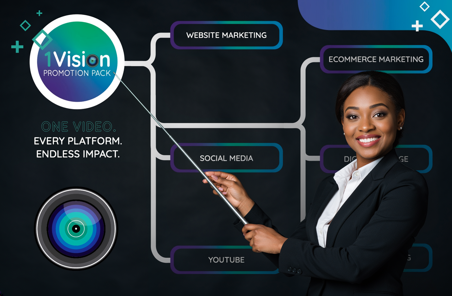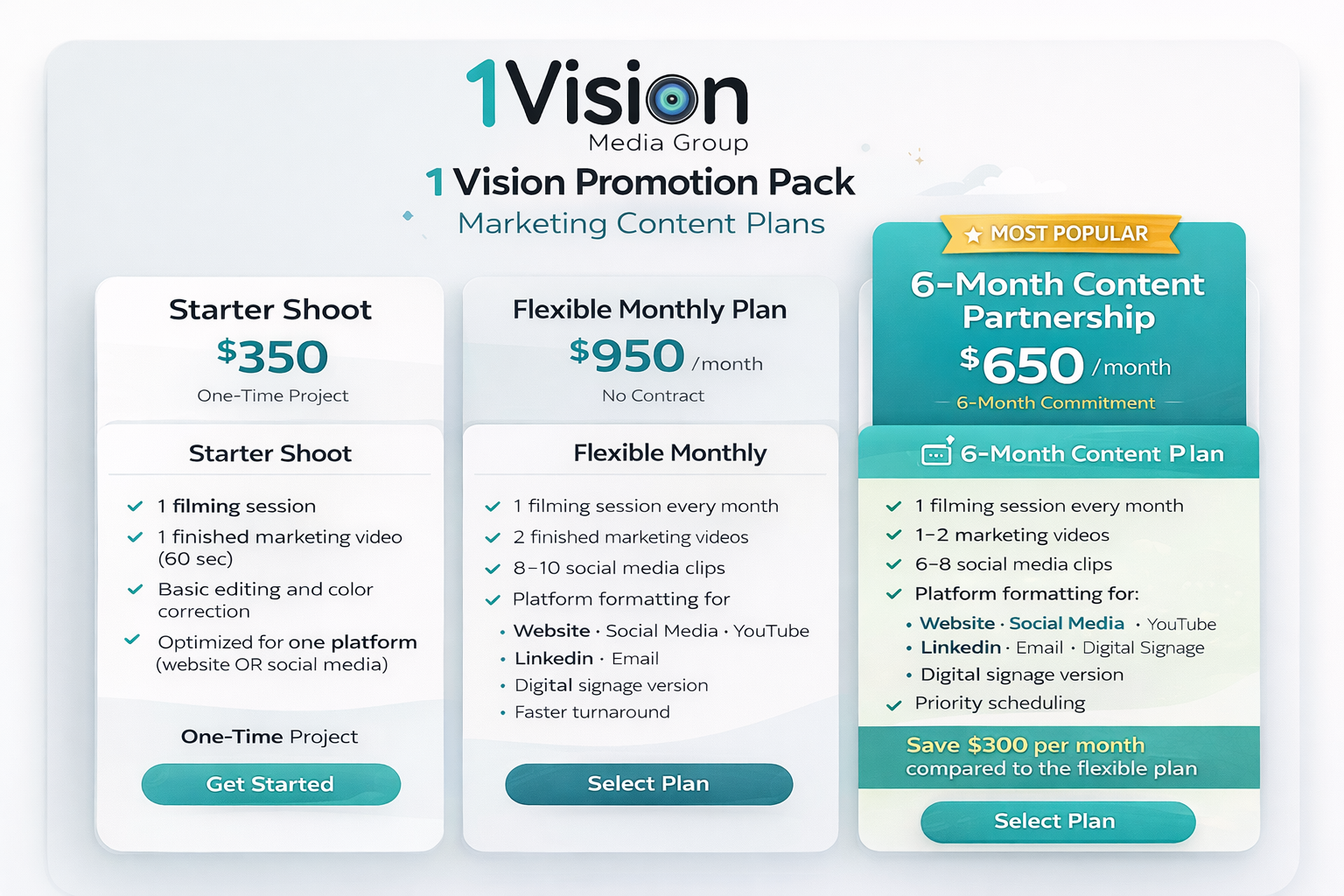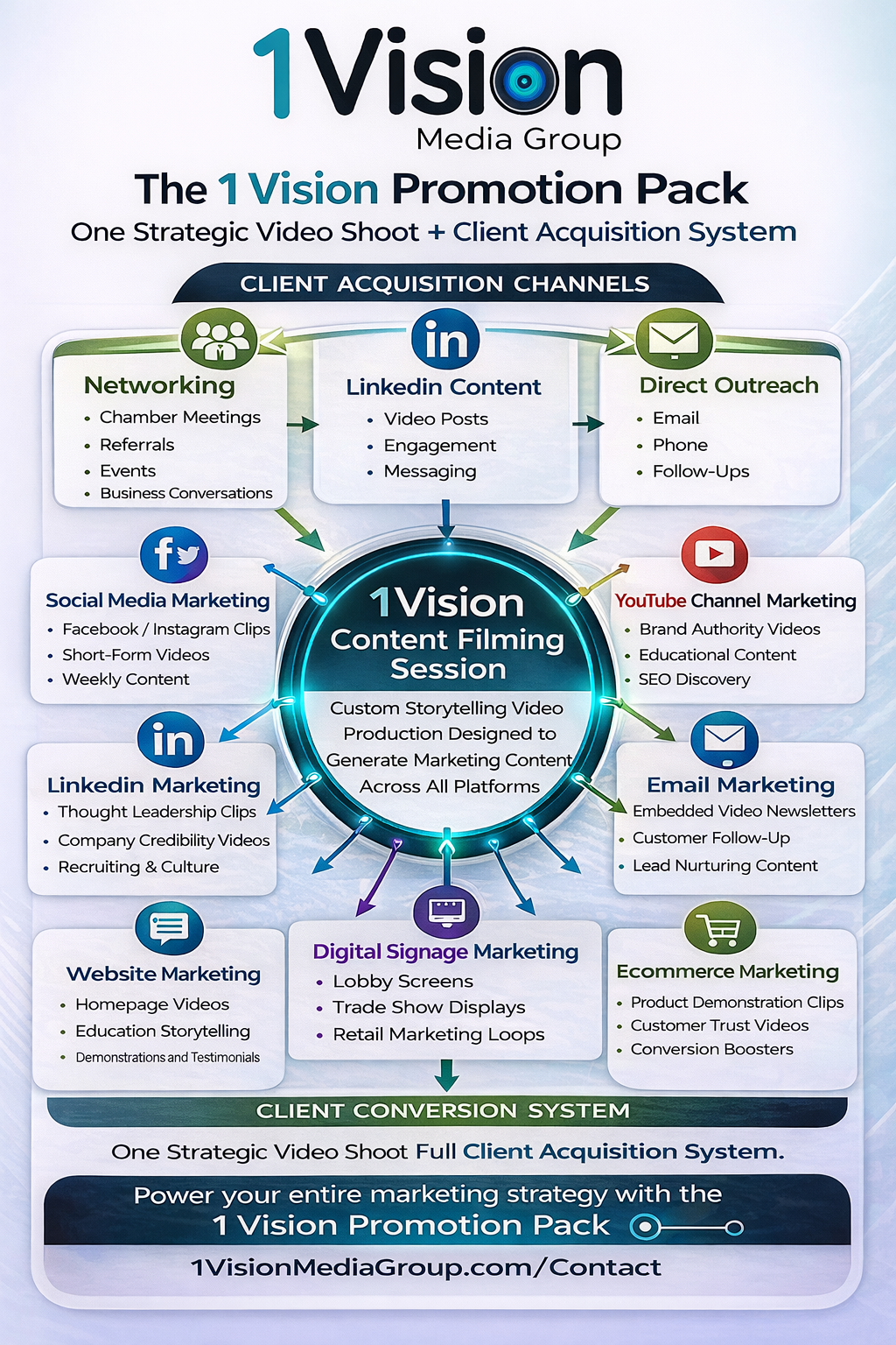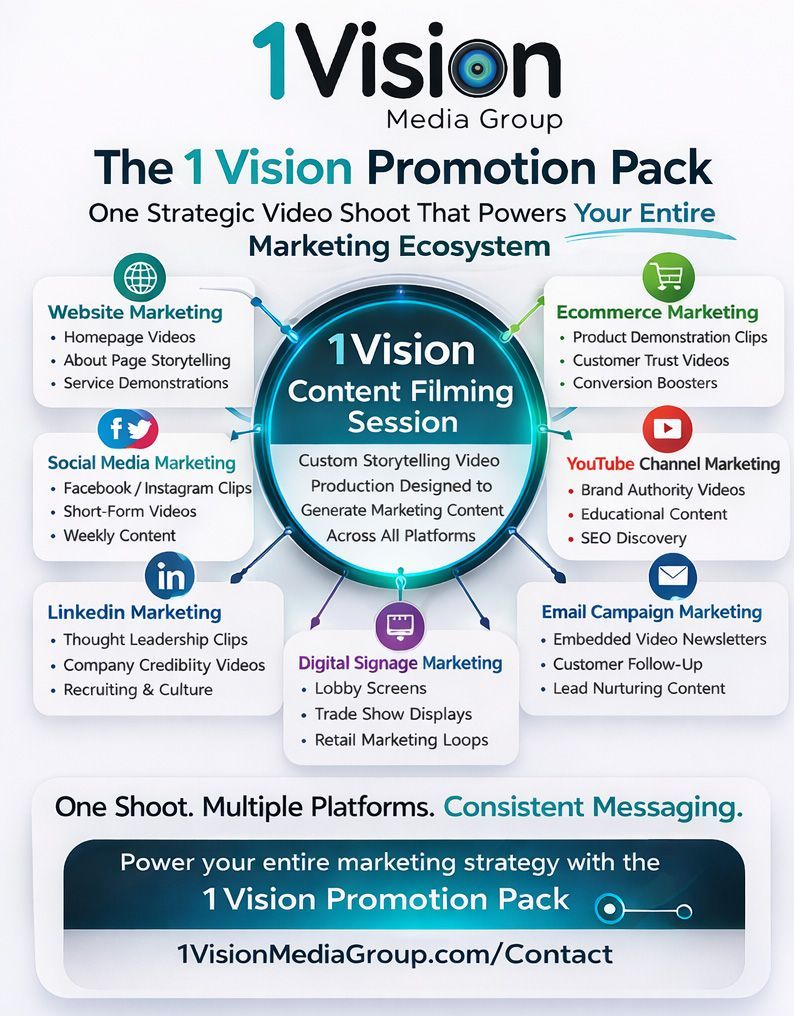 The result? A cohesive, high-impact marketing presence that extends far beyond one video shoot. With the 1 Vision Promotion Pack, one investment becomes many opportunities: a story that connects, a message that sells, and a brand experience that stays top of mind.